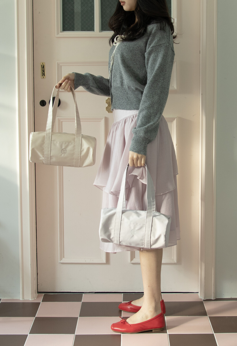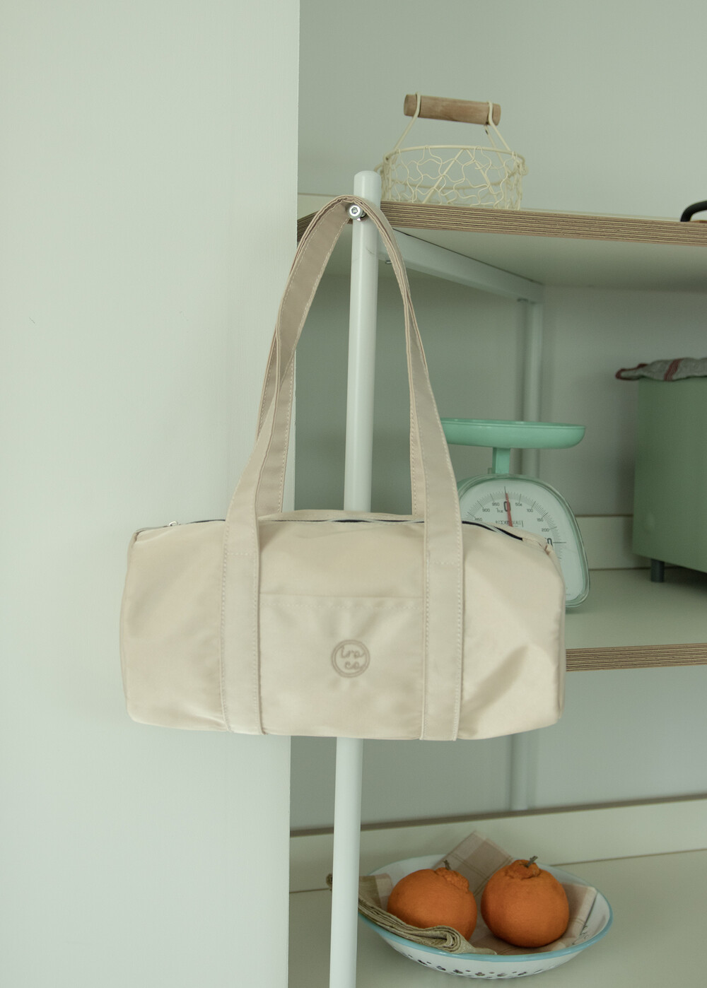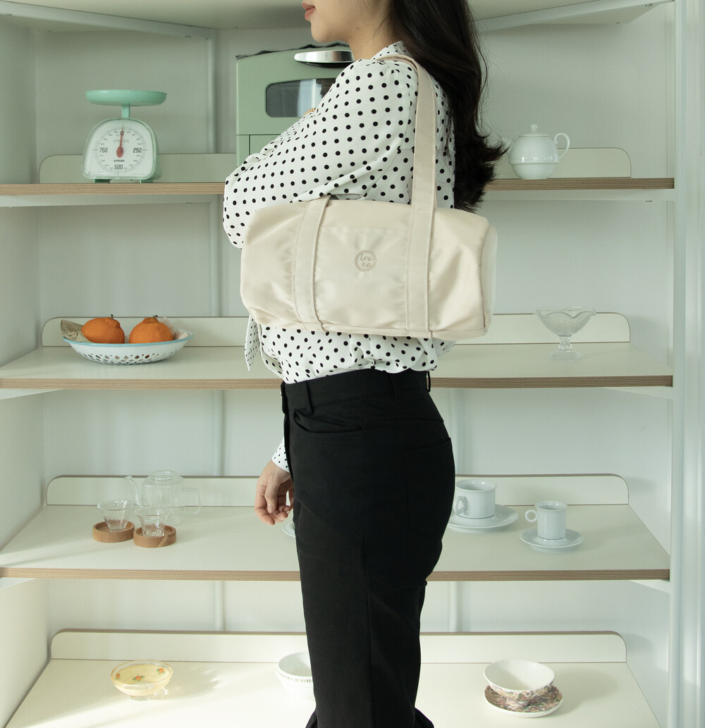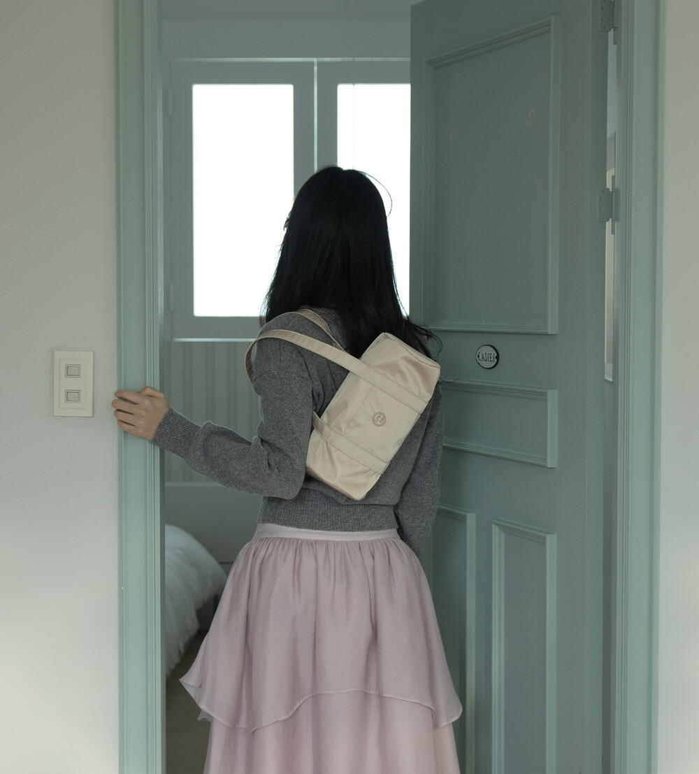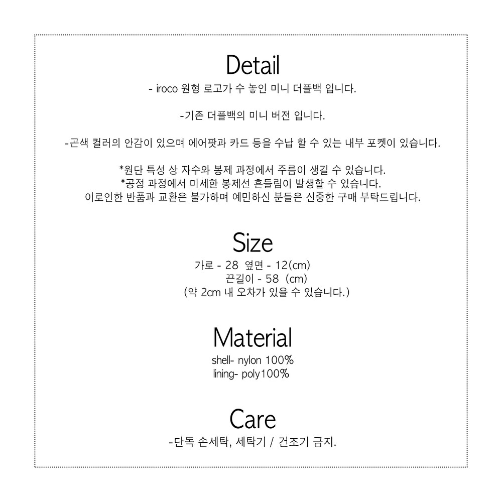 가방 중앙에 iroco 원형 로고가 수 놓인 나일론 미니 더플백 입니다. (기존 더플백의 미니 버전) 안감이 있으며 에어팟과 카드 등을 수납 할 수 있는 내부 포켓이 있습니다. 은은하게 빛나는 트윌 원단을 사용하였습니다.