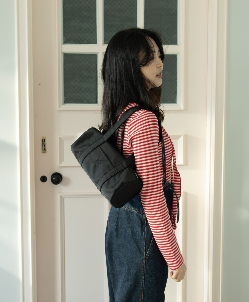 가방 중앙에 iroco 원형 로고가 수 놓인 나일론 미니 더플백 입니다. (기존 더플백의 미니 버전) 안감이 있으며 에어팟과 카드 등을 수납 할 수 있는 내부 포켓이 있습니다. 은은하게 빛나는 트윌 원단을 사용하였습니다.