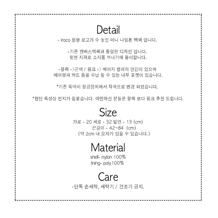 shell- nylon 100% lining- poly100% Made in China -단독 손세탁, 세탁기 / 건조기 금지.