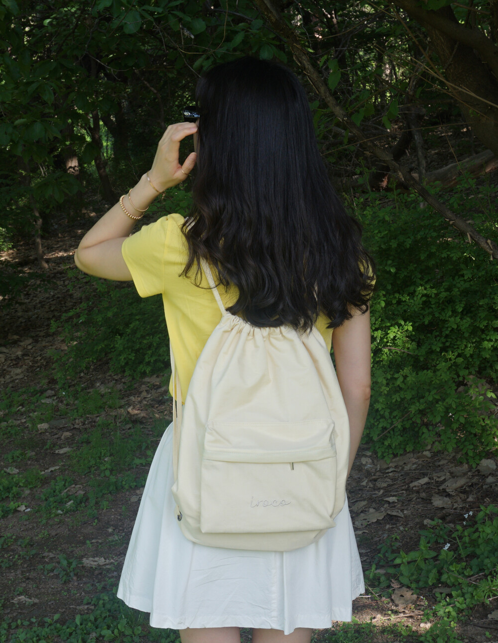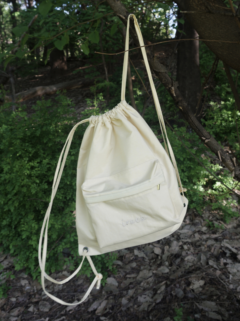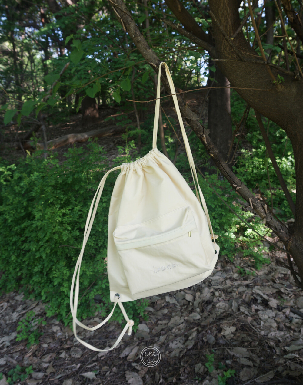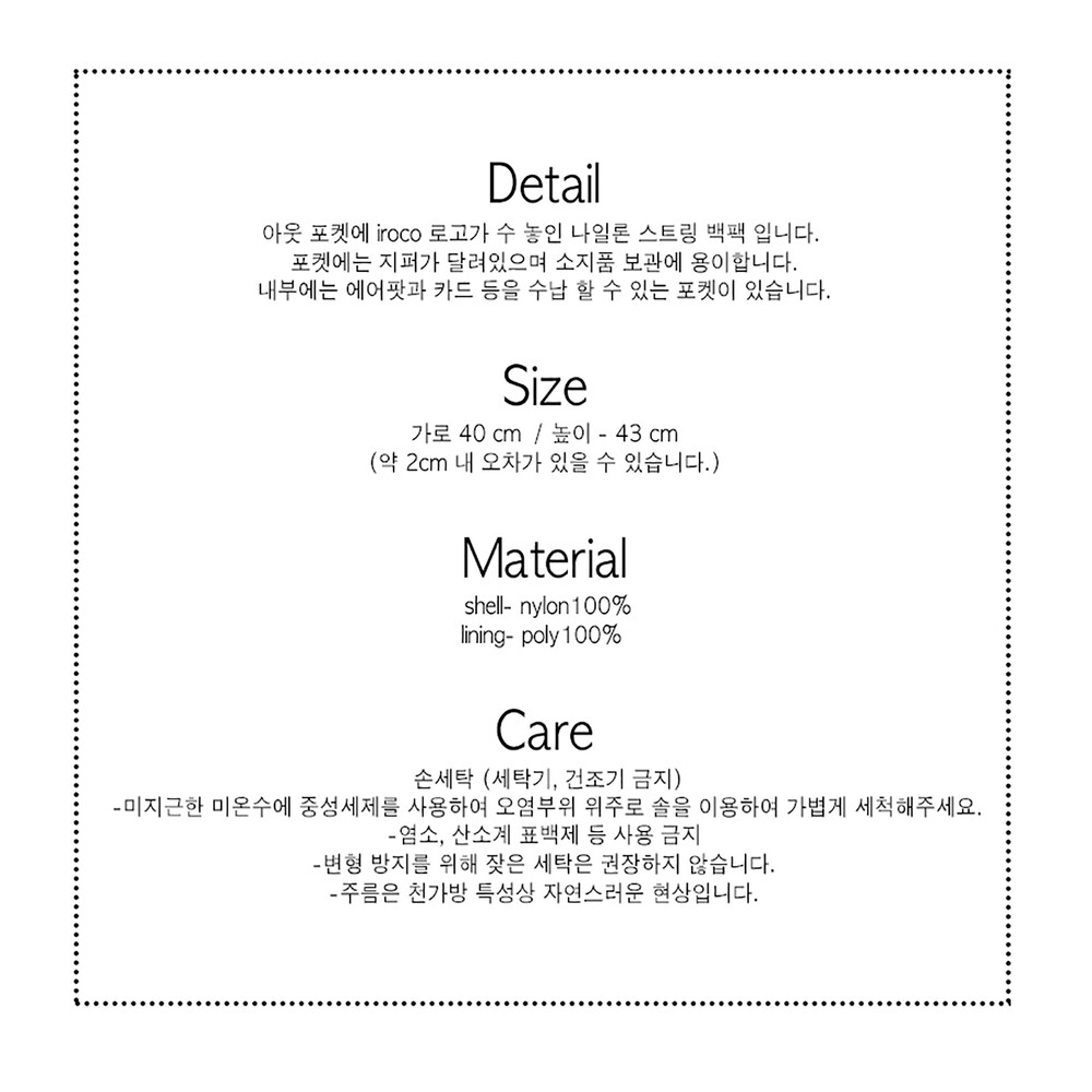 아웃 포켓에 iroco 로고가 수 놓인 나일론 스트링 백팩 입니다. 포켓에는 지퍼가 달려있으며 소지품 보관에 용이합니다. 내부에는 에어팟과 카드 등을 수납 할 수 있는 포켓이 있습니다.