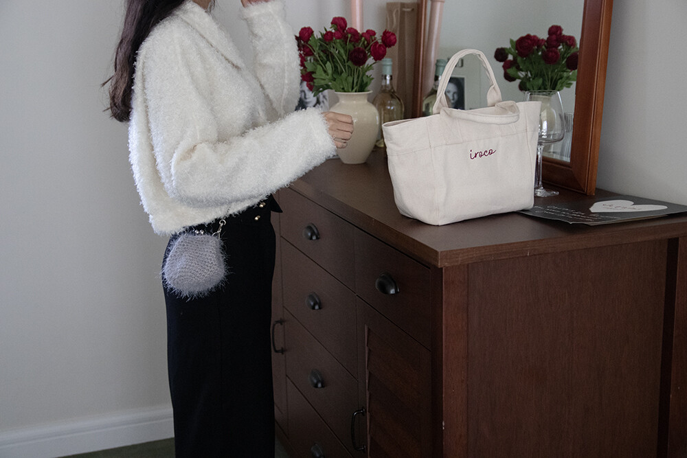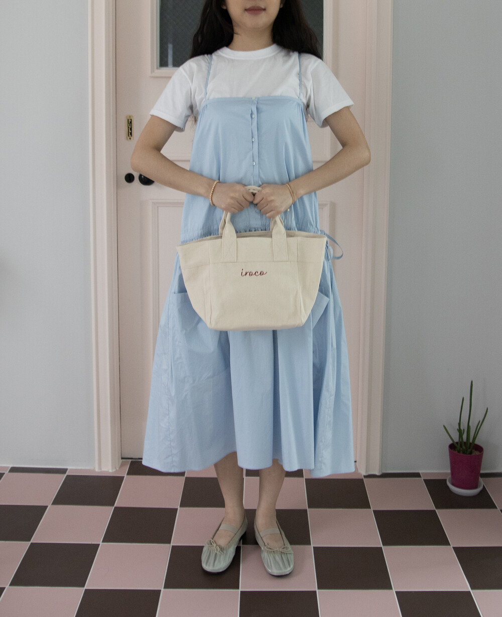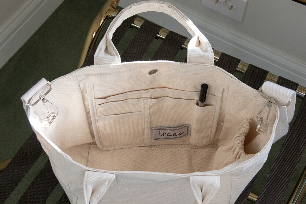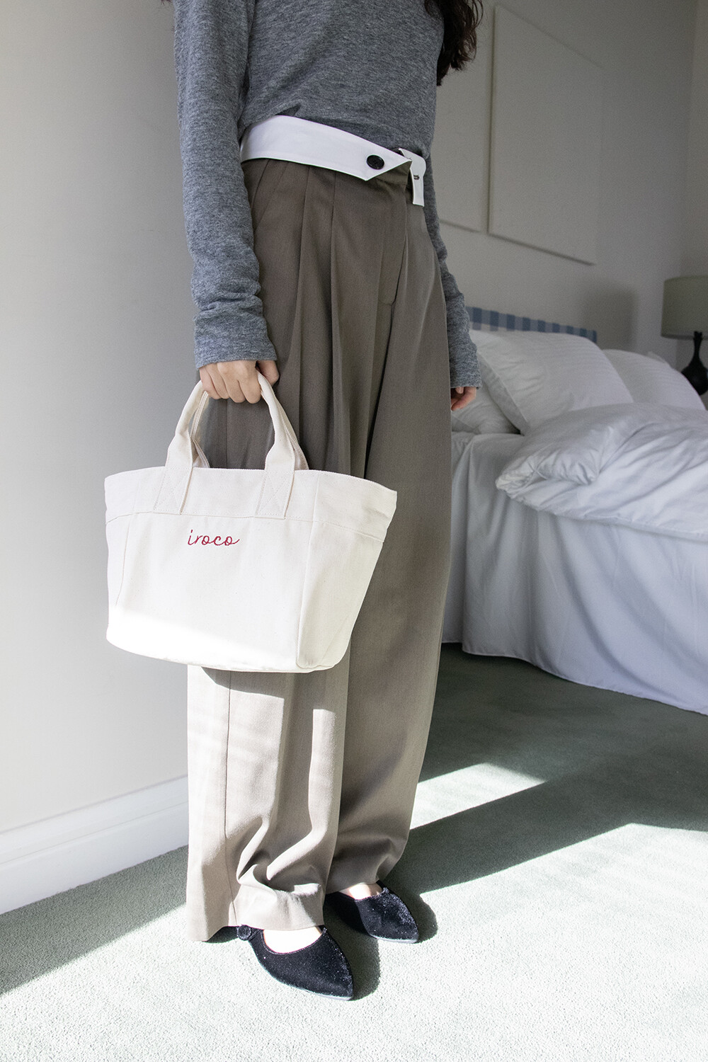 iroco의 로고가 수 놓인 수납력 좋은 미니백입니다. 크로스 끈 탈부착이 가능하여 토트백과 크로스백 둘다 가능한 활용도 높은 가방입니다. 탈부착이 가능한 크로스 끈은 길이 조정이 가능하여 기호에 따라 조절하여 사용하시면 됩니다. 제원단 두겹으로 만들어져 내구성이 좋으며 가운데 상단에 자석이 있어 모양을 잡아주며 여닫기 편합니다. 따로 텀블러와 펜 주머니를 포함한 총 5개의 주머니가 있어 소지품을 구분하여 수납 할 수 있습니다. 미니백이지만 가로 폭이 넓어 책과 11" 아이패드 또한 충분히 넣을 수 있는 크기입니다.